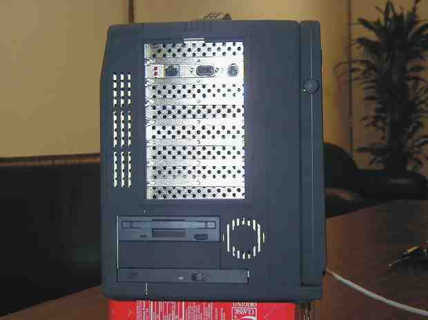 Pogled na zatvoreno računalo sa strane. Vidljiv je disketni uređaj, CD-čitač i jedan od zvučnika. Vrata za pristup karticama u slotovima je vidljiv.