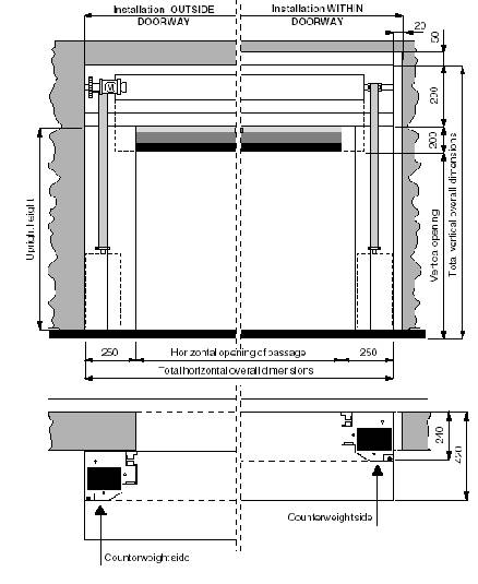 Tamo gdje se traži kratko vrijme otvaranja i zatvaranja zavjesnih vrata - Brzina otvaranja vrata do 1.4 m/s - Brzina zatvaranja vrata do 0.7 m/s - Male gabaritne mjere vrata s obzirom na svi- jetli otvor vrata - ukupna visina vrata do 300 mm veća od svijetle visine vrata - ukupna širina vrata do 500 mm veća od svjetle širine vrata - debljina konstrukcije vrata ovisno o tipu od 240 do 300 mm |